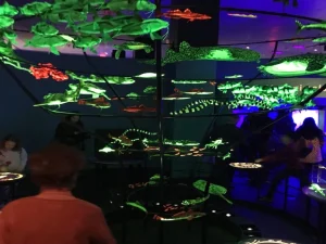 Read in Spanish At the entrance of the exhibit, waves bathe your feet in the form of a hologram. And, if you close your eyes and listen